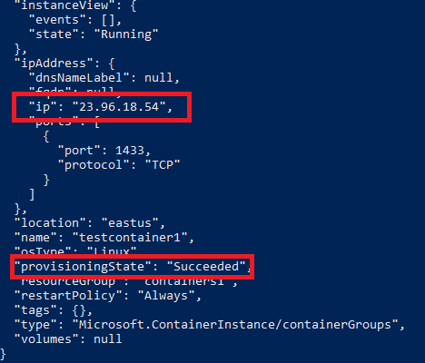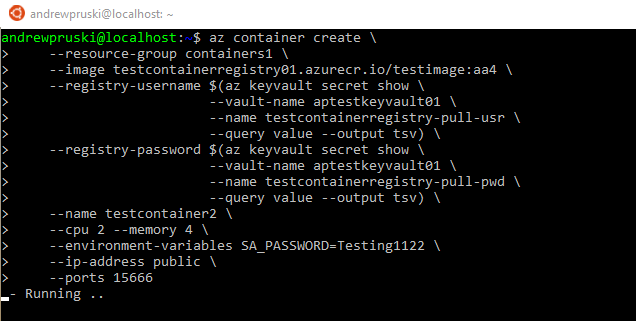 To make sure that it’s worked, let’s run an Azure Container Instance (using the credentials stored in the Key Vault created in Part One): –