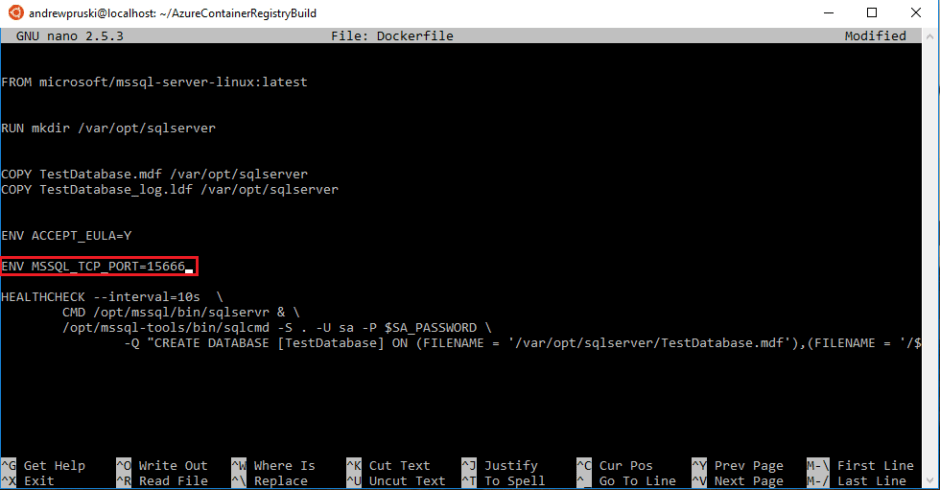 What we’re going to do is drop an environment variable into the dockerfile to change the port that SQL is listening on.