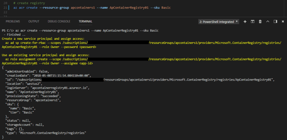 az acr create --resource-group apcontainers1 --name ApContainerRegistry01 --sku Basic