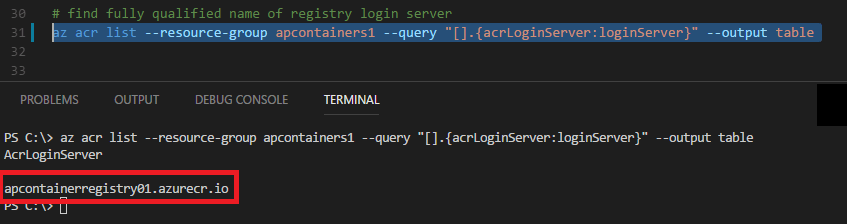 az acr list --resource-group apcontainers1 --query "[].{acrLoginServer:loginServer}" --output table