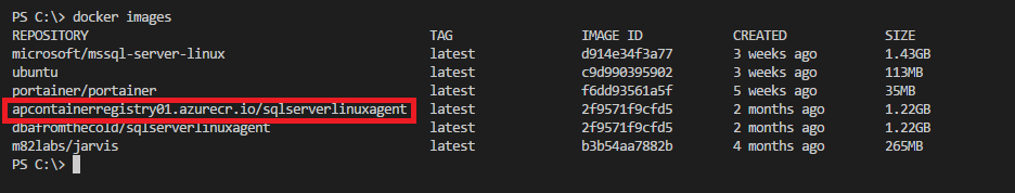 What this has done is create a repository called sqlserverlinuxagent with our image tagged underneath it. To see the image run: –