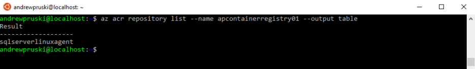 What this has done is create a repository called sqlserverlinuxagent with our image tagged underneath it. To see the image run: –