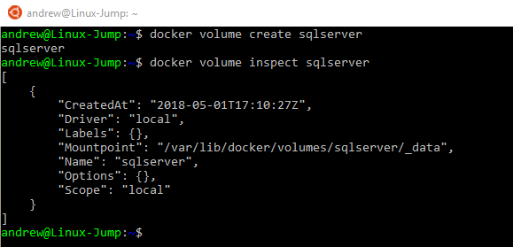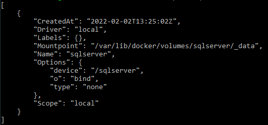 docker volume create --driver local -o o=bind -o type=none -o device=/sqlserver sqlserver