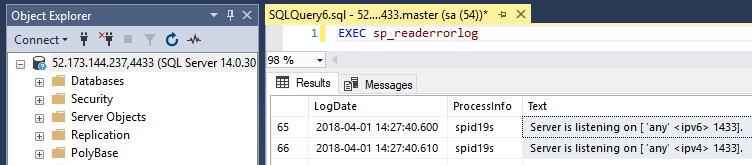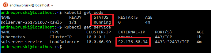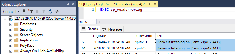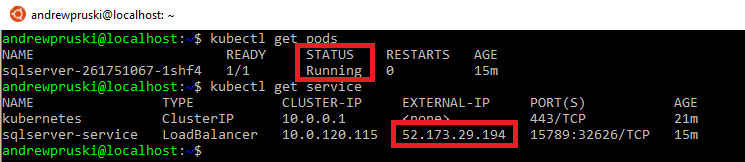 Once the pod has a status of Running and the service has an external IP, we can use the external IP and the port to connect to SQL in SSMS: –