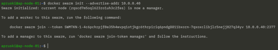 Now we can initialise the “manager” node, aka which node will manage the cluster. This can be thought of as like the control plane in a Kubernetes cluster. Much like a Kubernetes cluster…there are two types of node in Docker Swarm…managers and workers. Again like Kubernetes, a node can perform both roles.