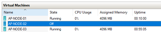 I have a lab setup on my local machine which consists of three Hyper-V VMs with static IP addresses, that can all communicate with each other: –