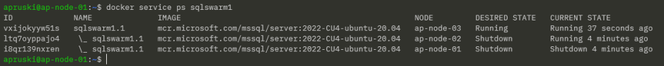 My service is running on AP-NODE-01…that’s the manager node for the cluster so we probably don’t want our service running there. Let’s move it to another node.
