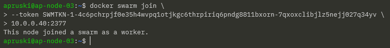 docker swarm join \ --token SWMTKN-1-4c6pchrpjf0e35h4wvpq1otjkgc6thrpiriq6pndg8811bxorn-7qxoxclibjlz5nejj027q34yv \ 10.0.0.40:2377