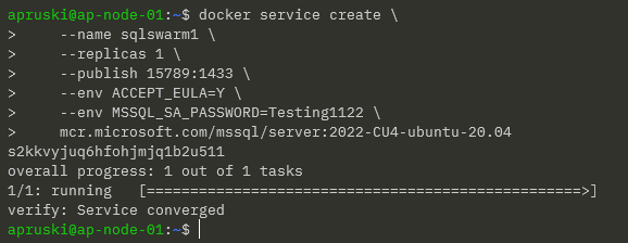 Looks pretty much like a docker container run statement yeah? The only difference really is the –replicas=1 statement. This essentially is how many containers we want to run in our service (called tasks in Docker Swarm). As we’re running SQL Server, we only want one running for this service.