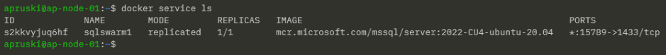Our container was run with the –publish 15789:1433 flag. This means that we can connect to SQL in the Swarm via any of the nodes’ IP addresses and the port 15789 (kinda like a NodePort service in Kubernetes).