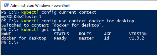 In the above screenshot I switched from my mySQLK8sCluster1 (my AKS cluster) to docker-for-desktop and then ran: –