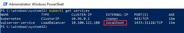 The service we created is exposed on localhost (127.0.0.1) so we can use that and the port number specified in the yaml file (1433 in this example).
