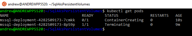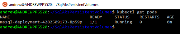 One thing that has been missing though, is persistent storage. Any changes made to the SQL instance would have been lost if the pod that it was running in failed and was brought back up.