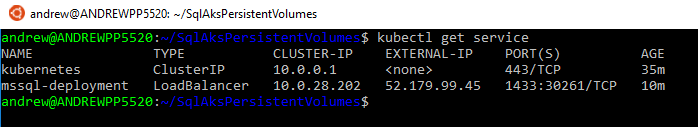 What this does is spin up a pod with our SQL instance running from my custom image dbafromthecold/sqlserverlinuxagent:latest. It then maps the persistent volume claim to /var/opt/mssql to our pod (this is the important step). Finally, creates a service so that we can connect to the instance using the service’s external IP and the password specified in the secret.