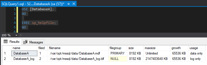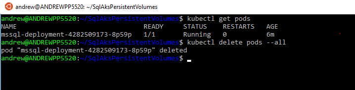 The database files were created in /var/opt/mssql/data which is on the volume that we mapped to the persistent volume claim. This means that if the existing pod fails, the database files will be retained and available in the new pod.