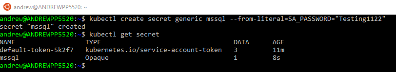 kubectl create secret generic mssql --from-literal=SA_PASSWORD="Testing1122"