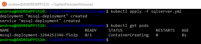 What this does is setup a storage class (as an Azure-Disk) and then specifies a persistent volume claim. It is the persistent volume claim that we will use to attach to the SQL Server instance within the pod.