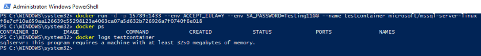 The Linux VM has to have at least 3250MB of RAM available to it in order to run a SQL Server container. But when you run an individual container you can limit that container to less than 3250MB, as I’ve done here.