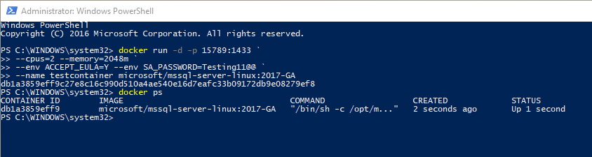 docker run -d -p 15789:1433 ` --cpus=2 --memory=2048m ` --env ACCEPT_EULA=Y --env SA_PASSWORD=Testing11@@ ` --name testcontainer microsoft/mssql-server-linux:2017-GA