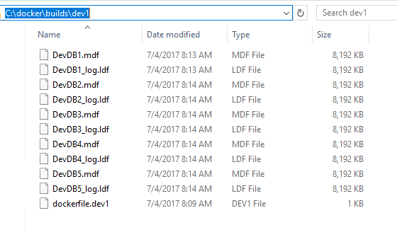Within the C:\docker\builds\dev1 directory, I’m going to drop my database files and my dockerfile: –