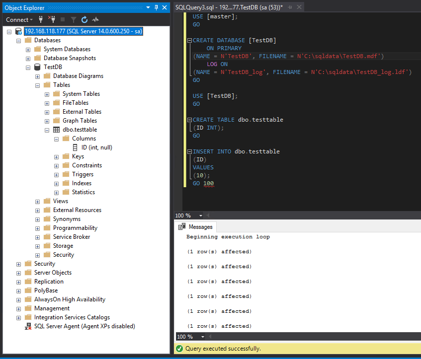 Once you have the IP, connect to the SQL instance within the container and create a database (same as in Part One): –