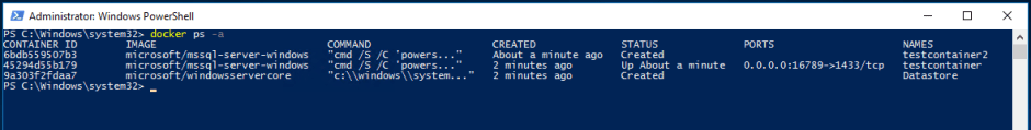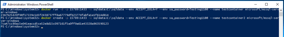 docker create -d -p 16789:1433 --env ACCEPT_EULA=Y --env sa_password=Testing11@@ --volumes-from Datastore --name testcontainer2 microsoft/mssql-server-windows
