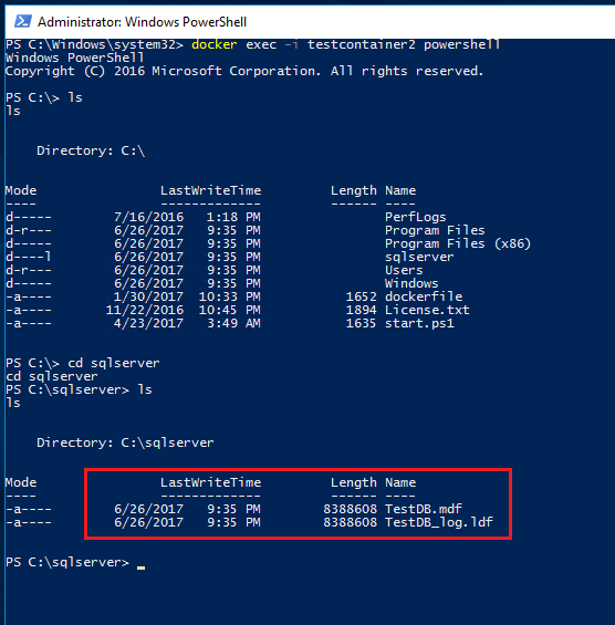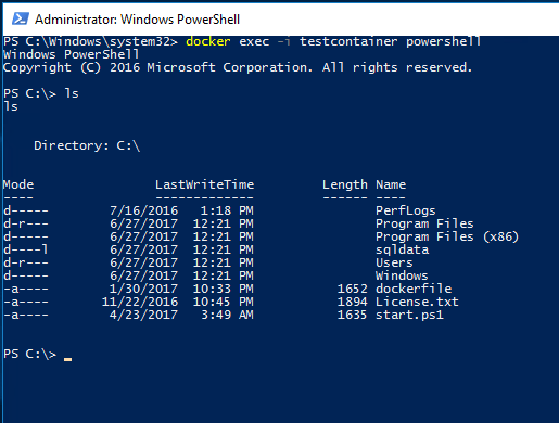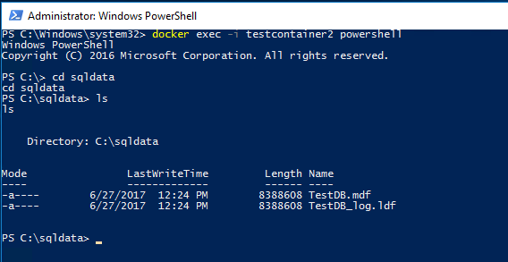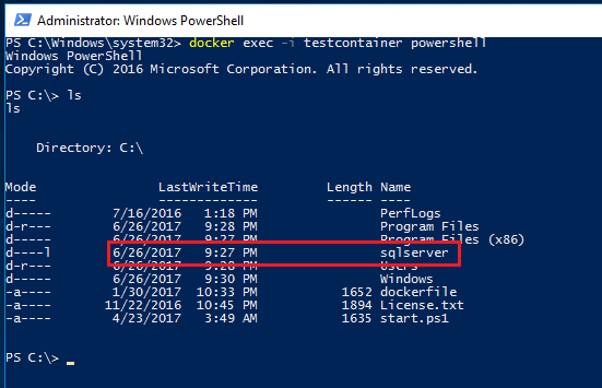 docker exec -i testcontainer2 powershell ls cd sqlserver ls