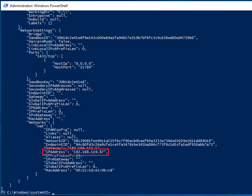 Loopback has now been enabled for Windows containers, so we can use localhost,16789 to connect locally. You can read more about it here