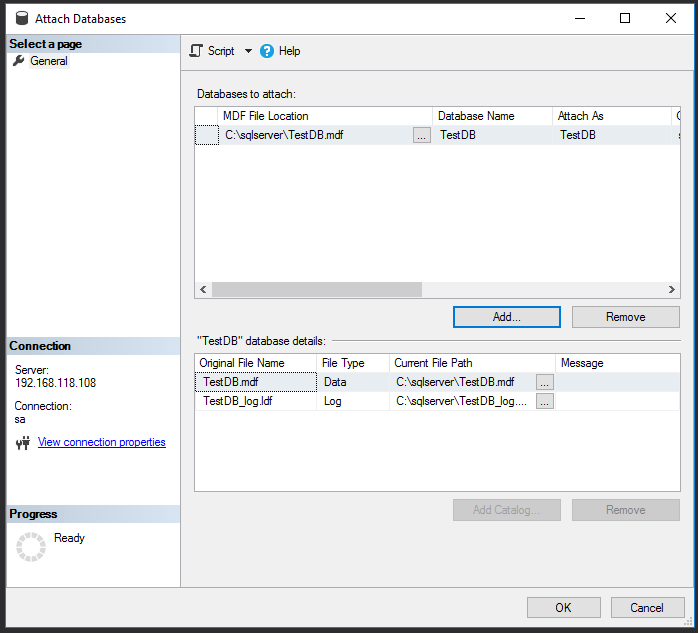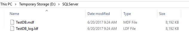 (NAME = N'TestDB_log', FILENAME = N'C:\SQLServer\TestDB_log.ldf')
