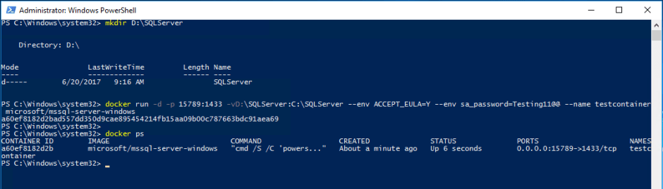 docker run -d -p 15789:1433 -v D:\SQLServer:C:\SQLServer --env ACCEPT_EULA=Y --env sa_password=Testing11@@ --name testcontainer microsoft/mssql-server-windows
