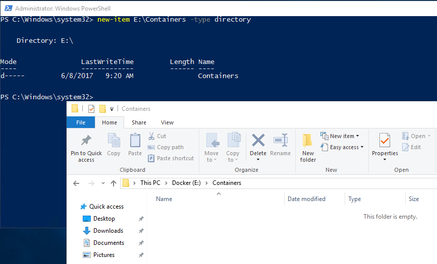 So that’s built us a container running an empty instance of SQL Server with the D:\SQLServer directory on the host mounted as C:\SQLServer in the container.
