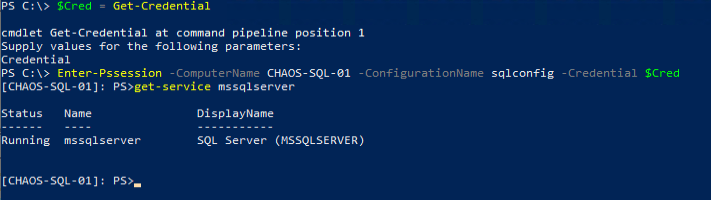 $Cred = Get-Credential Enter-Pssession -ComputerName <<SERVERNAME>> -ConfigurationName sqlconfig -Credential $Cred