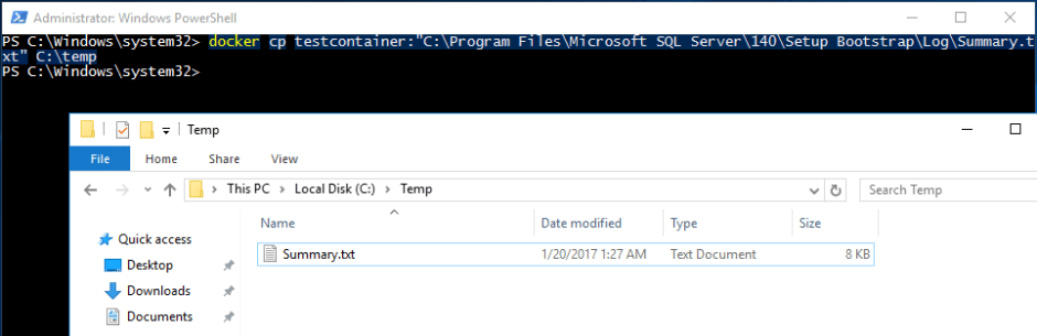 docker cp testcontainer:"C:\Program Files\Microsoft SQL Server\140\Setup Bootstrap\Log\Summary.txt" C:\temp