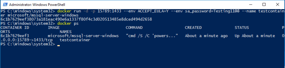 docker run -d -p 15789:1433 --env ACCEPT_EULA=Y --env sa_password=Testing11@@ --name testcontainer microsoft/mssql-server-windows